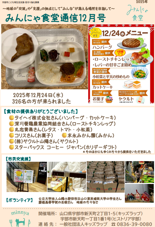 【みんにゃ食堂通信】 2023年12月 投稿日 2023年11月23日 更新日 2023年12月25日 著者 かねこキッズクラブ カテゴリー みんにゃ食堂お知らせ 食材提供ありがとうございました。(株)丸忠青果さん(株)アースクリエイティブさん (株)ヤクルト山陽さん 山口アポロ石油(株)さん マルト製菓さん 出雲ファームさん くらよしさん 末永みかん園さん 株式会社コケナワさん *そのほかにも多くの方々から提供いただきました。 かねこキッズクラブ こども食堂 みんにゃ食堂 子ども食堂 学習室 宇部市 山口県 西法寺